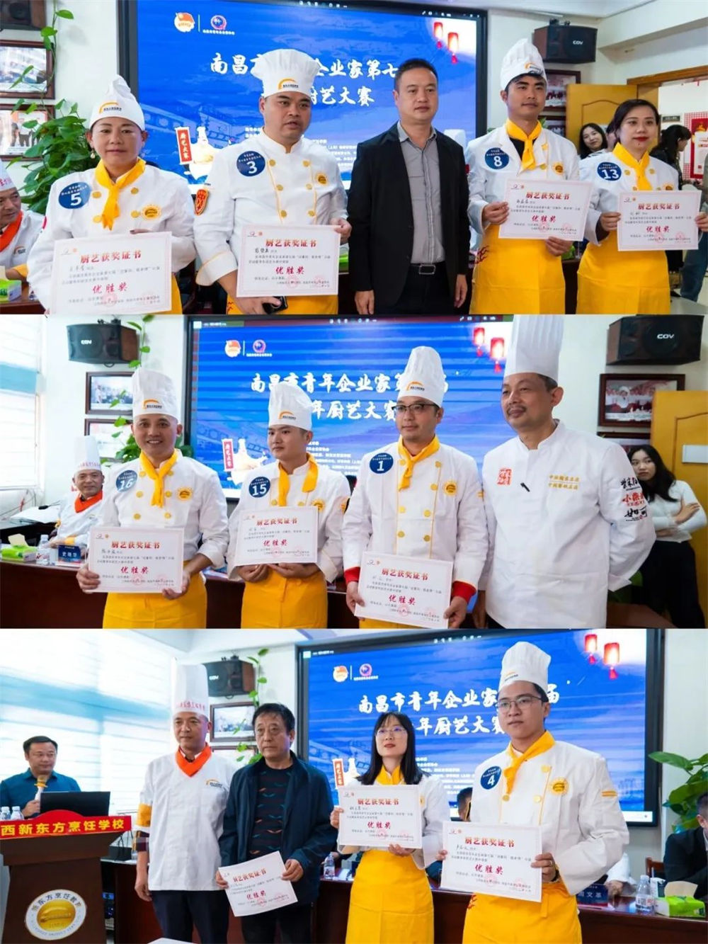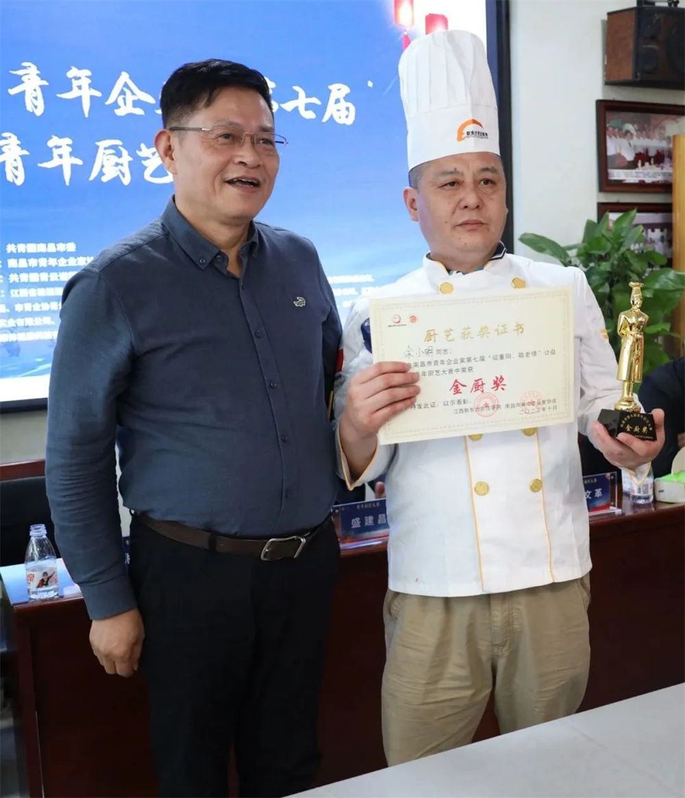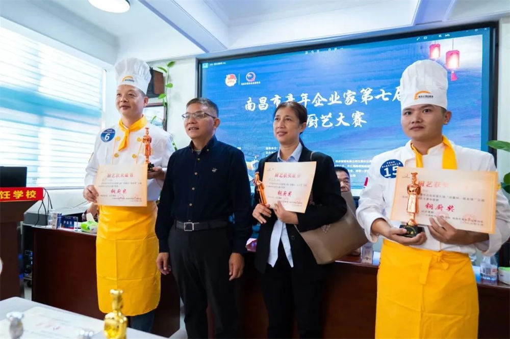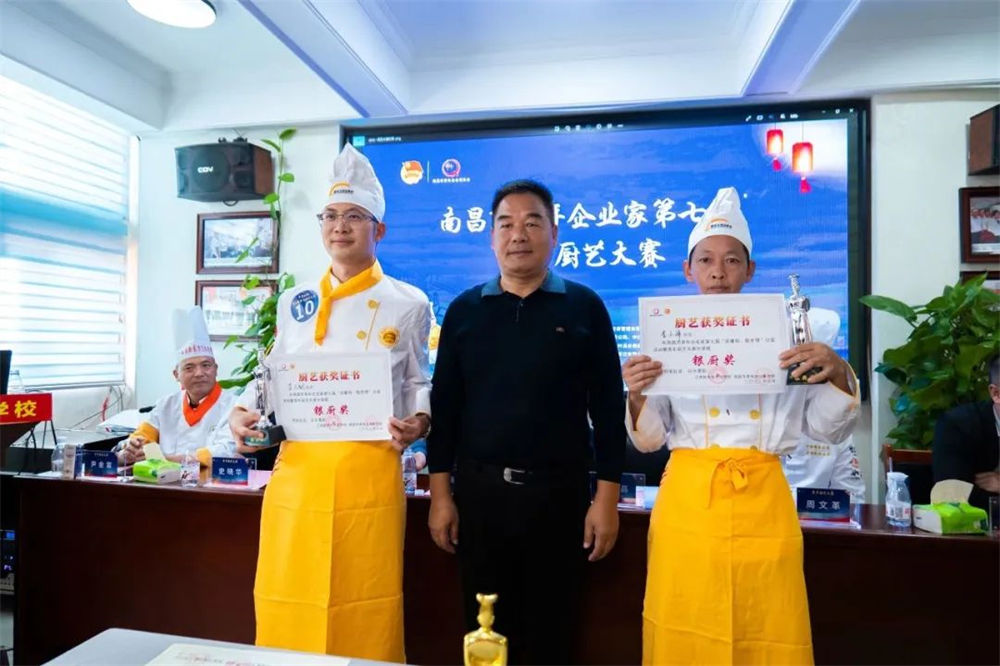 南昌市青年企业家BB贝博艾弗森官方网站执行会长谢德平、柴米油盐/小柴米餐饮有限公司行政总厨周文革、江西新东方烹饪学校教务主任尹金富为“优胜奖”颁奖