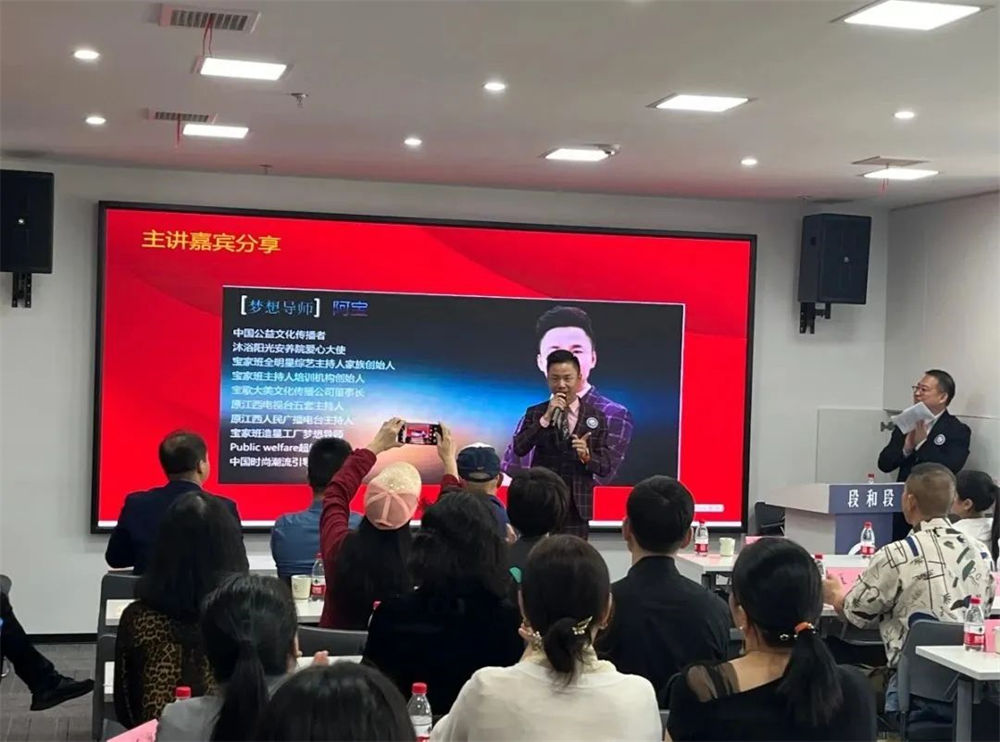 会上,邀请了原江西五套主持人阿宝老师为在座青年企业家分享演讲技巧,干货满满,现场掌声不断。