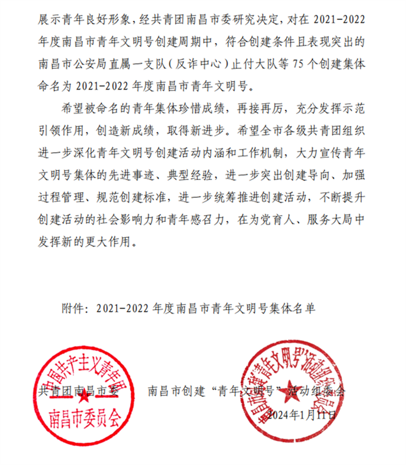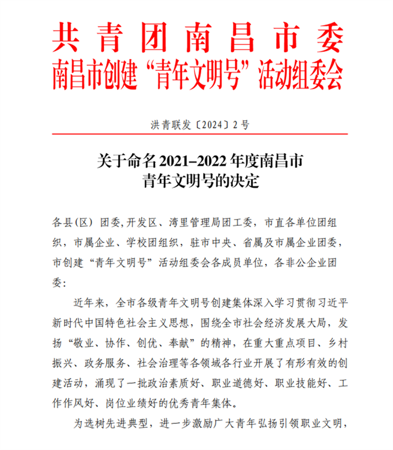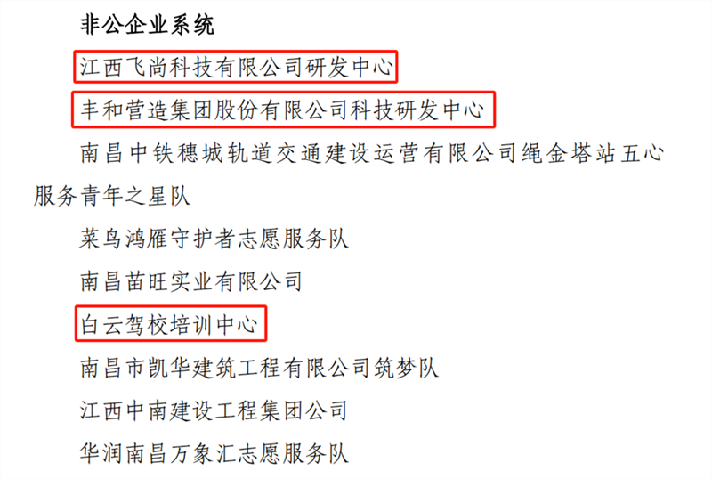 由市青企协推荐的丰和营造集团股份有限公司科技研发中心?、白云驾校培训中心,市青企协南昌县办事处推荐的江西飞尚科技有限公司研发中心获评“2021-2022年度南昌市青年文明号”。