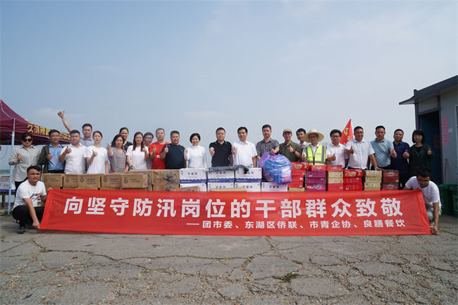 东湖区委副书记贾彧超,团市委副书记曾晋,东湖区委统战部副部长、侨联主席姚涛,市青企BB贝博艾弗森官方网站长揭建刚带领青年企业家们捐赠防汛抗洪物资