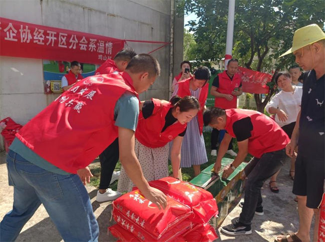 炎炎夏日斗酷暑 浓浓关怀送清凉。2020年8月13日下午,南昌市青年企业家BB贝博艾弗森官方网站经开区分会长熊长宝、理事张小虎等一行赴青山湖区白水湖管理处鸡山村新区开展“送清凉”行动,为困难党员、困难群众送去大米、食用油等爱心物资共计60箱,白水湖管理处党委委员胡斌、党政办主任袁必洪代表群众表示感谢。