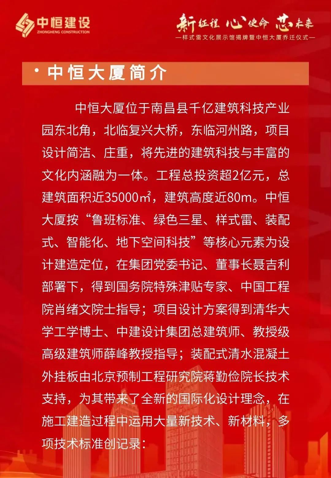 中恒建设集团经历43年的发展,2023年乔迁至位于南昌县千亿建筑科技产业园的中恒大厦,同时,中恒建设集团是样式雷文化的传承者、践行者和创新者,并在中恒大厦打造了样式雷文化展示馆。